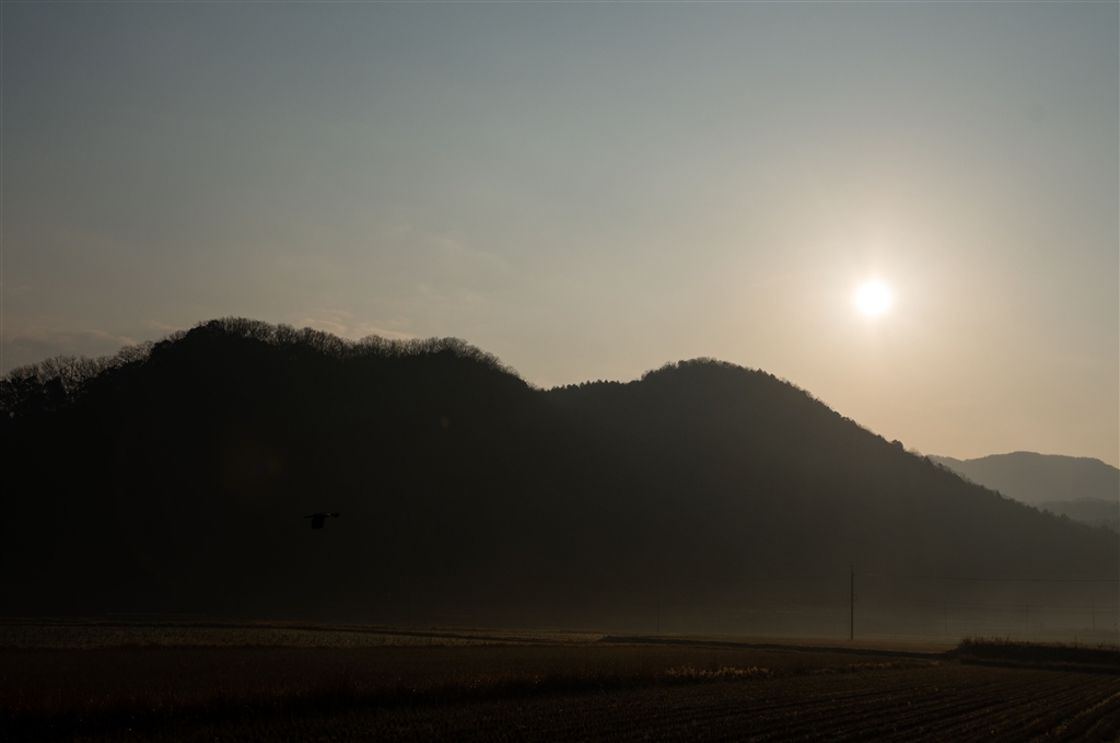 水田地帯も靄っと。