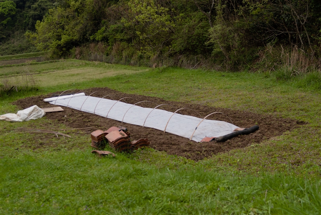 苗床に苗箱を並べシートを