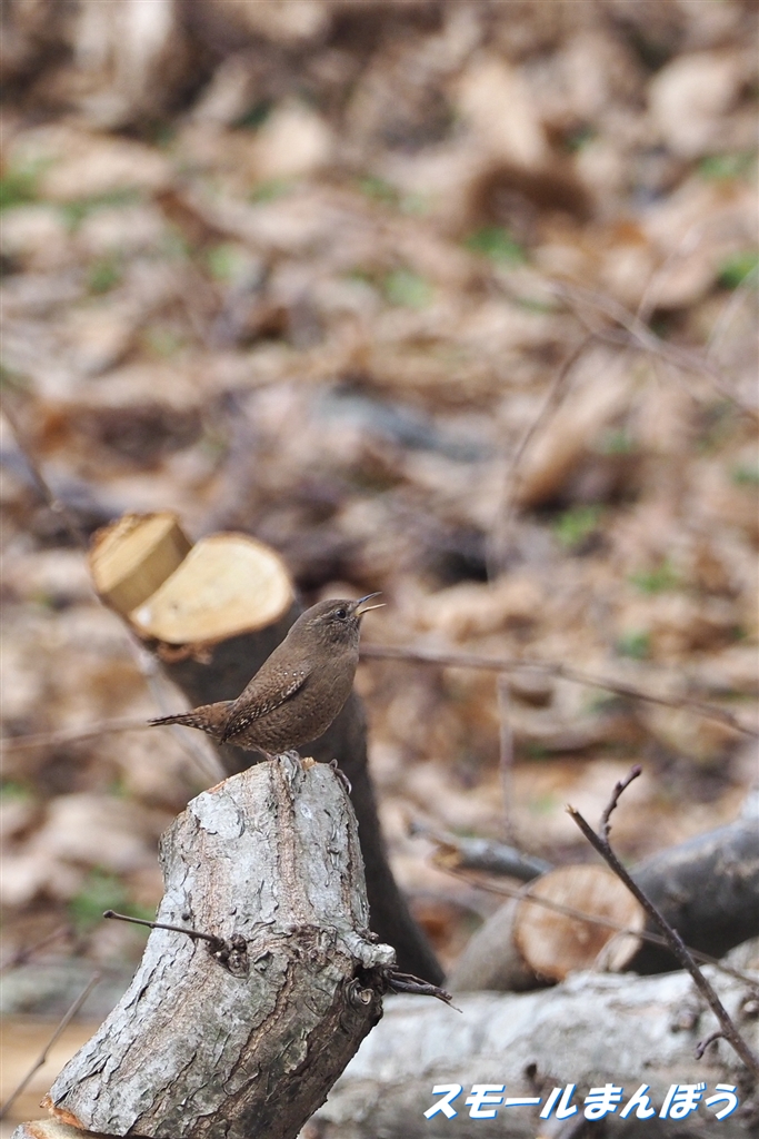 山積みされた枝の山で囀るミソサザイ