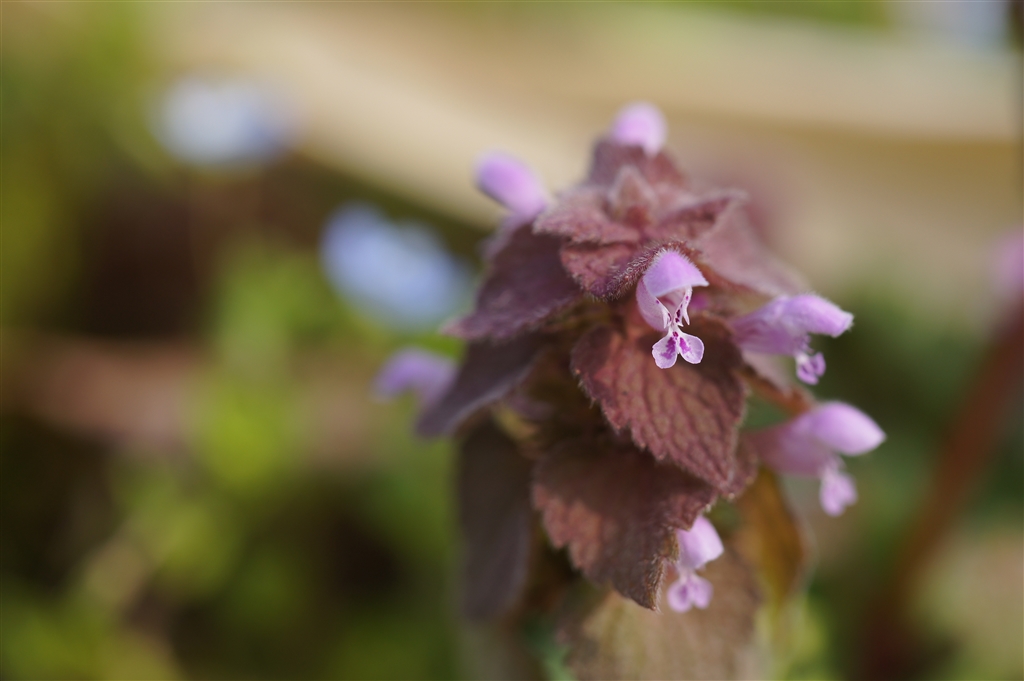 公園の道路脇に咲くヒメオドリコソウ。