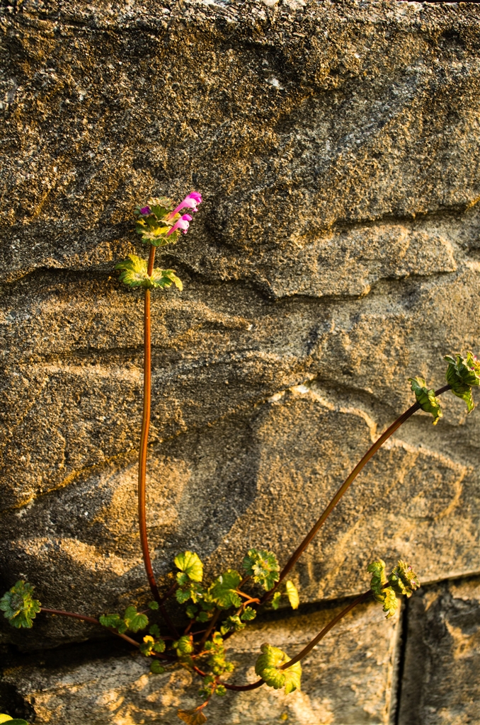 垂直な石垣に生えた「ホトケノザ」