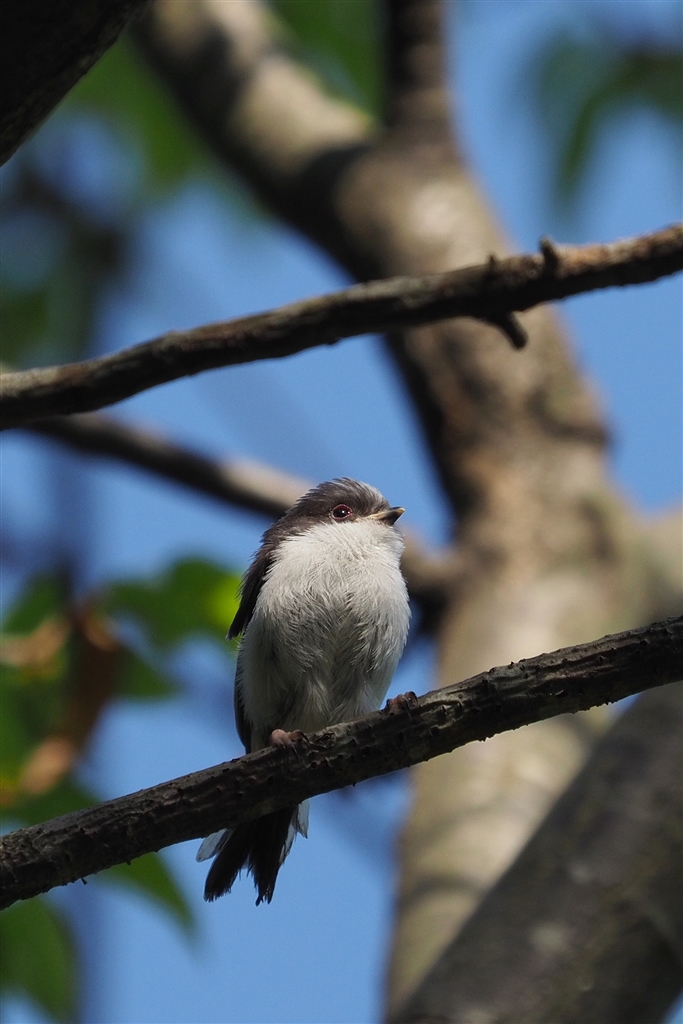 エナガの幼鳥、尾羽は短く瞼は赤い。