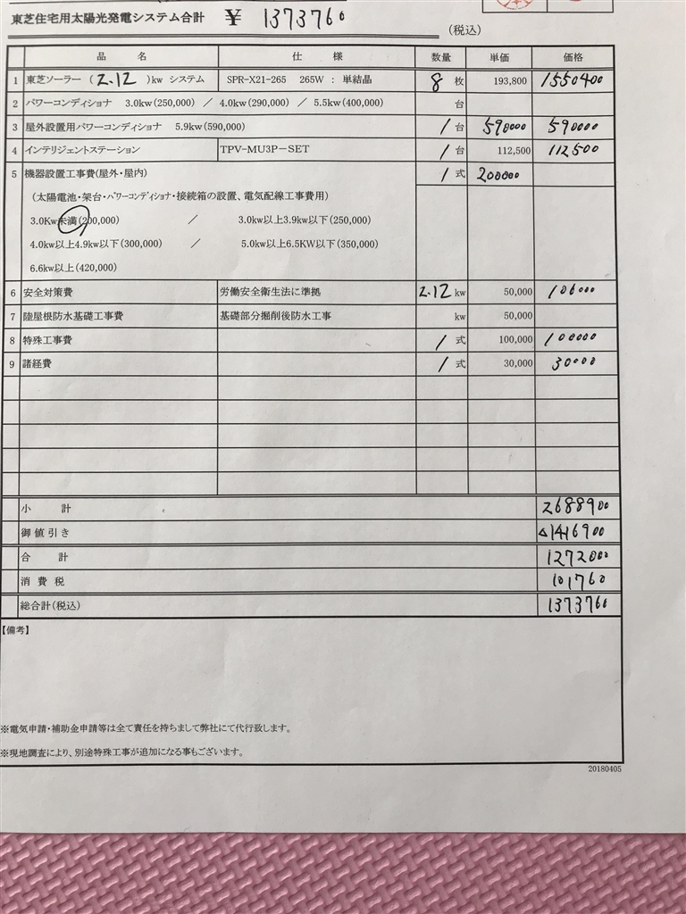 『見積もり書』 太陽光発電 東芝すべて surry728さんのクチコミ掲示板画像1/1
