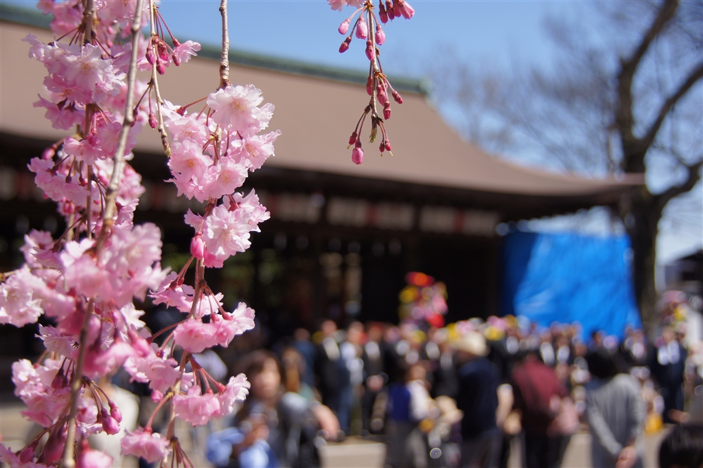 枝垂れ桜と祭りの風景。