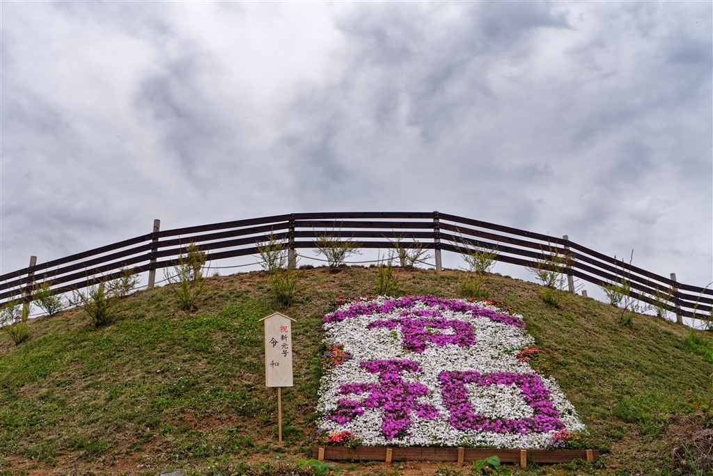 芝桜で「令和」の文字。広島県世羅高原、花夢の里。