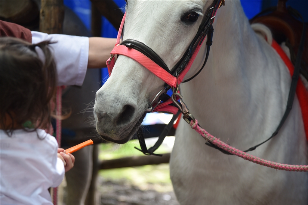 馬の待機場でおやつをあげられます。