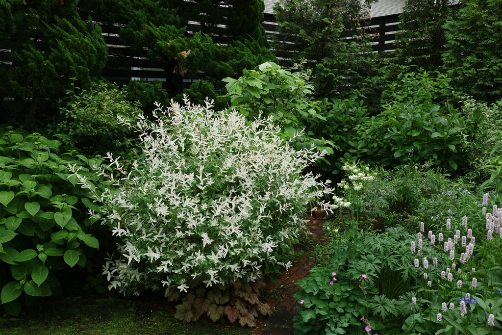 雨の日に存在感ある「五色柳(白露錦)」