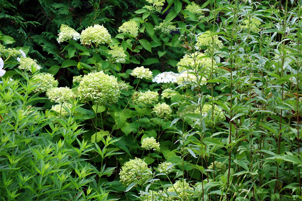 アナベルが白から緑に変わってきました。後ろはウツギ、咲き始めました。