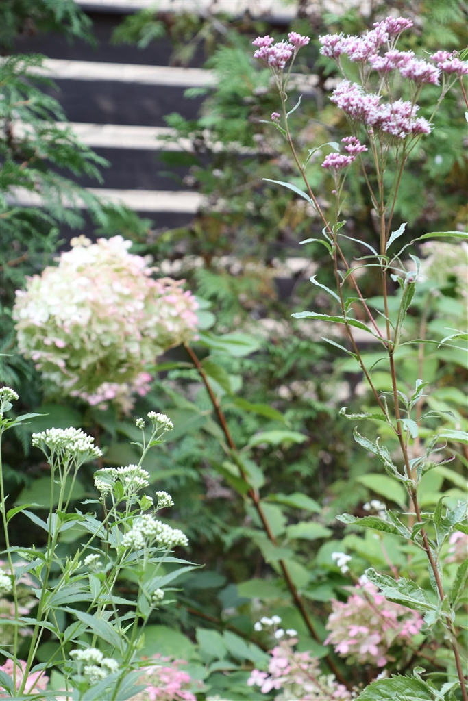 白とピンクのフジバカマの間に見えているのは、枯れ色の「ノリウツギ」