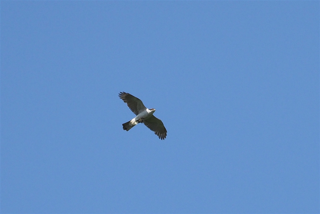 木立の切れ間の遥か上空、獲物を掴んだオオタカ? (弥彦公園)