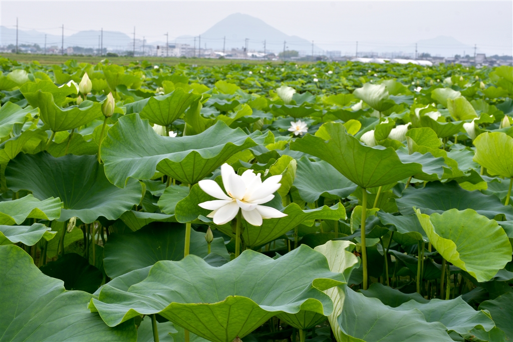 私の独り占めの蓮畑。遠くに見えるは近江富士。