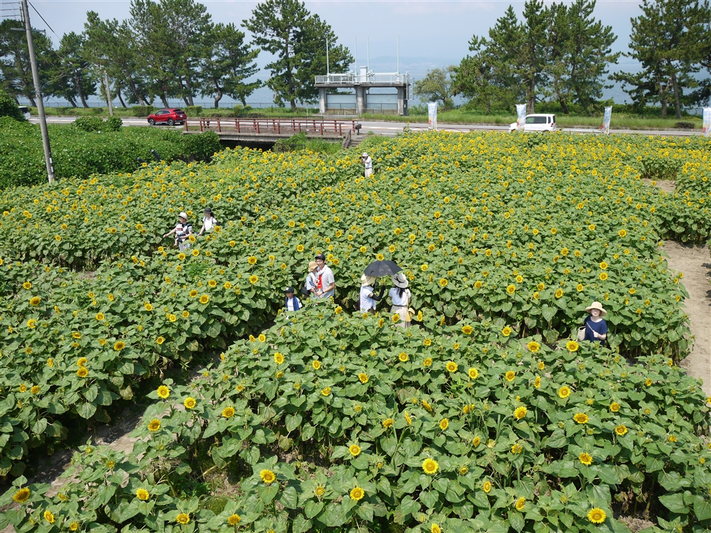 おいで野洲ひまわり迷路2019、展望台から湖岸道路方面を望む。