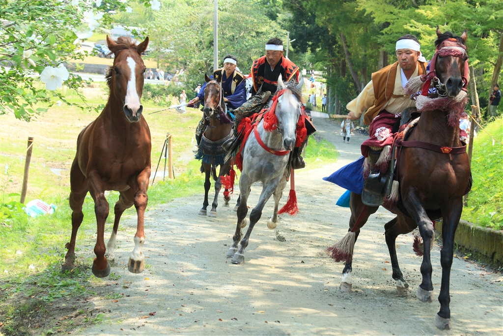野馬を騎馬が神社境内の囲いに追い込む