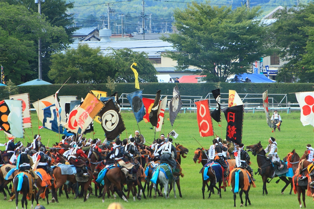 舞い降りてくる御神旗(ここでは黄色)を目がけて馬を駆る