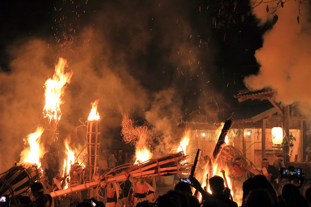 お旅所で大松明を立てて注連縄伐りを行う