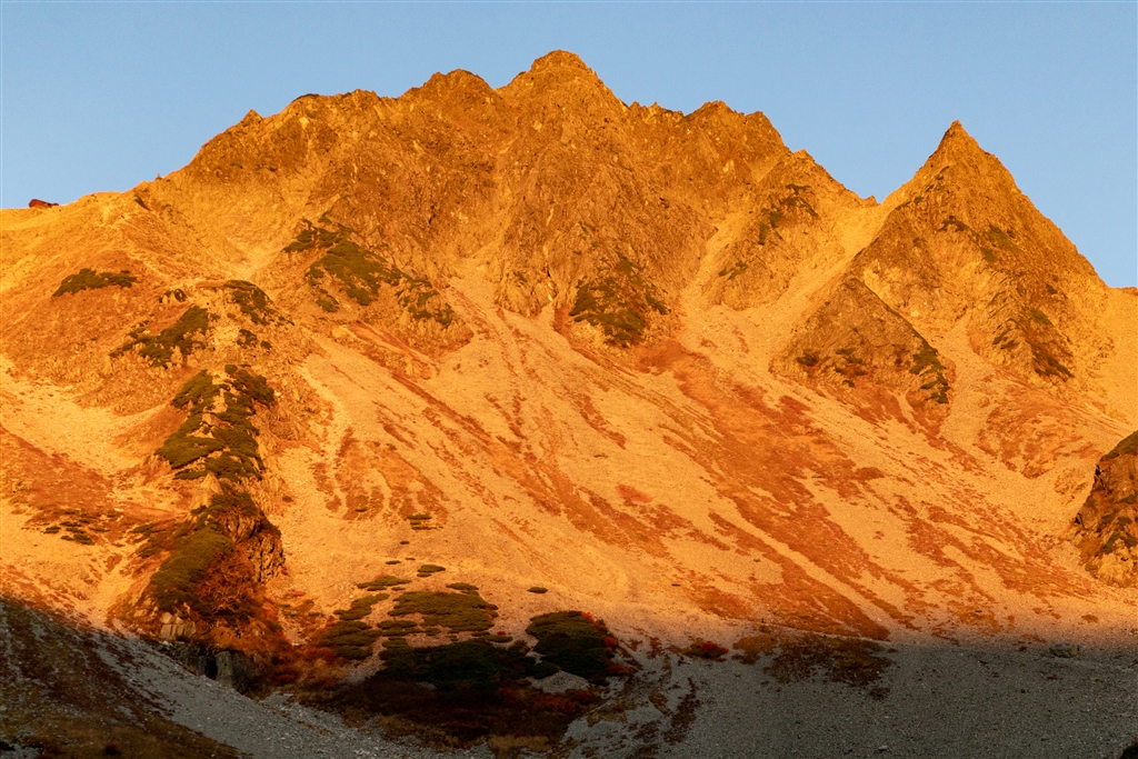 左から穂高岳山荘、涸沢岳、涸沢槍
