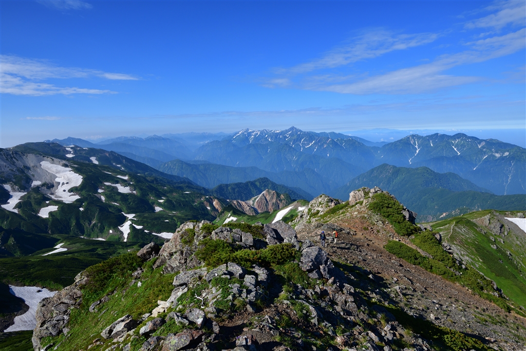 旭岳山頂から。杓子岳のカールと立山と劔岳