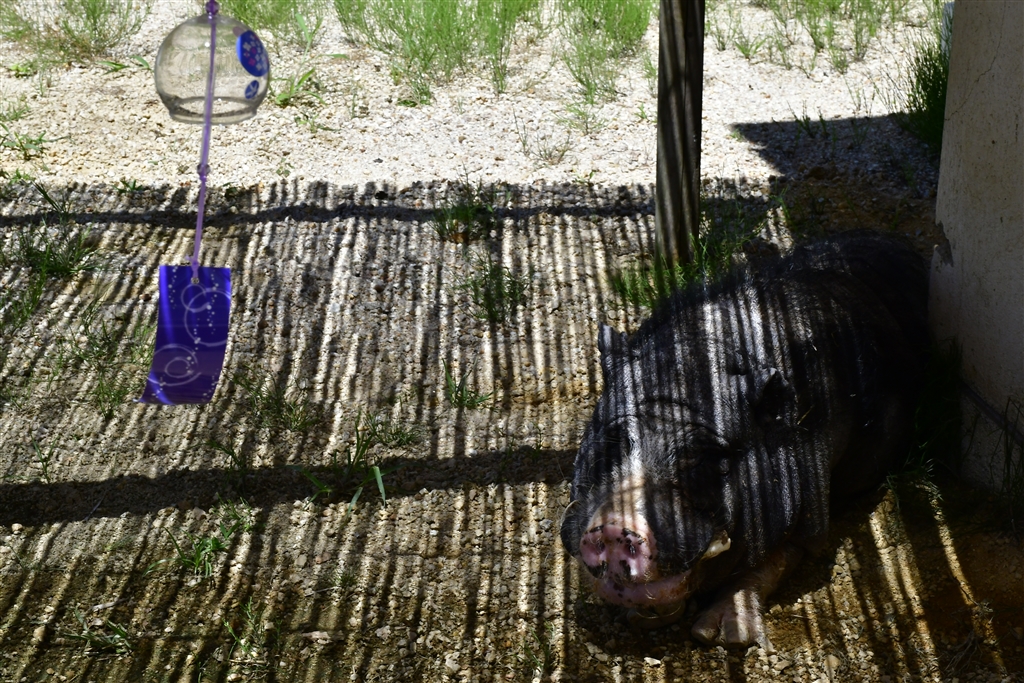 ネコちゃんと風鈴の音色が涼をかもしだします(一般的にはイノシシさんと言うかも?)