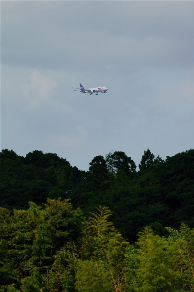 FedEx B777F 木々の谷間に