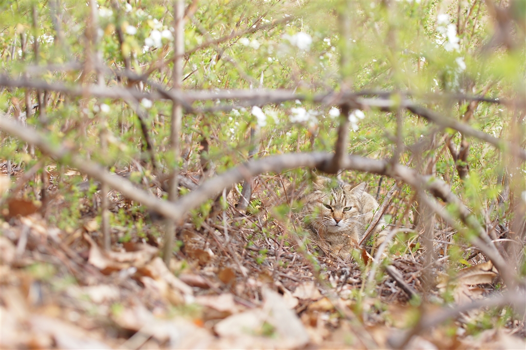公園の野良猫さん…植木の隙間からこんにちわ。