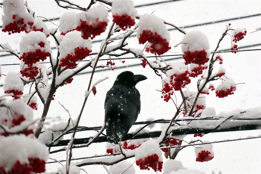 急な積雪に戸惑っているかのようなカラスと街路樹のナナカマド