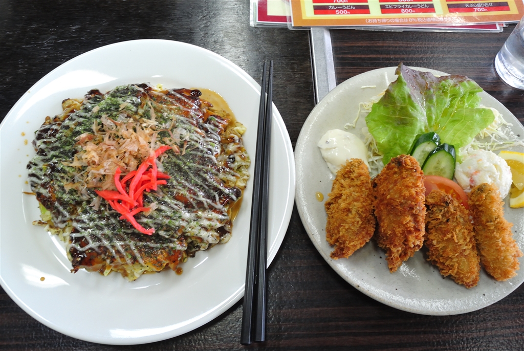 カキオコはお好み焼きの上にカキを全面に並べて焼いた物