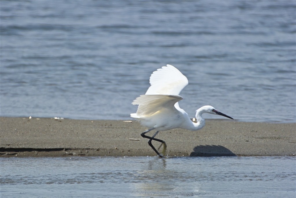 浅瀬で小魚を見つけると 抜き足差し足どころか長い足で駆けます