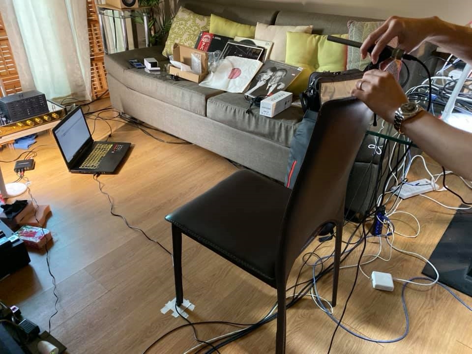 マイクで集音中(椅子の脚にはテープでマーキング)