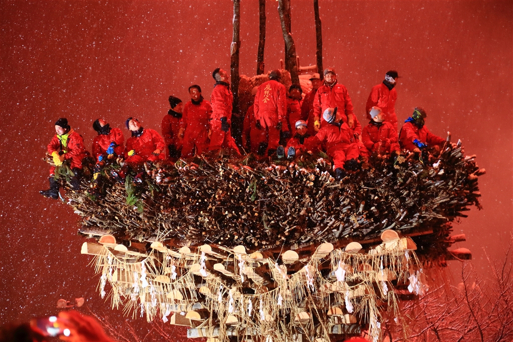 組んだ社殿に男衆が乗り道祖神唄を歌って威勢をつける(赤いバックは打上花火のため)
