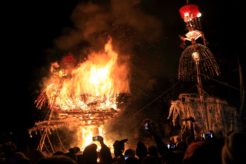 社殿にかなり火が回ったところで灯籠(2灯)も燃やしてしまう