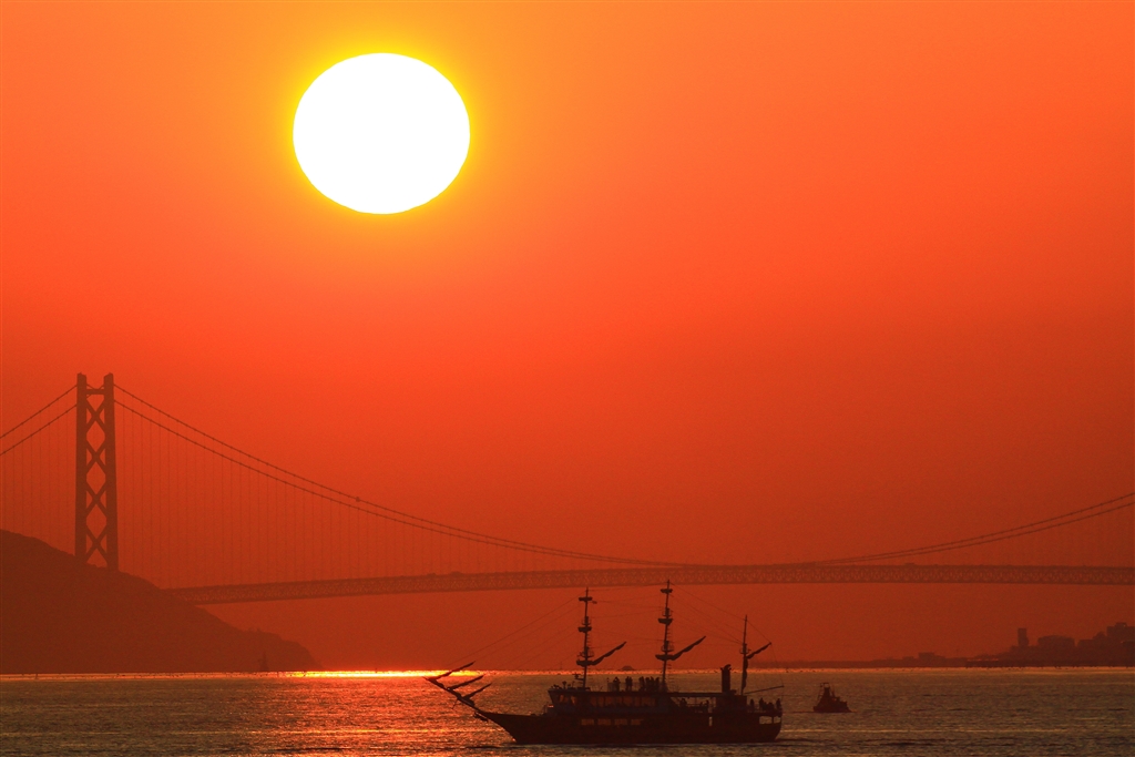 明石海峡大橋の向こうに夕陽が沈む(10年も前の写真ですみません)