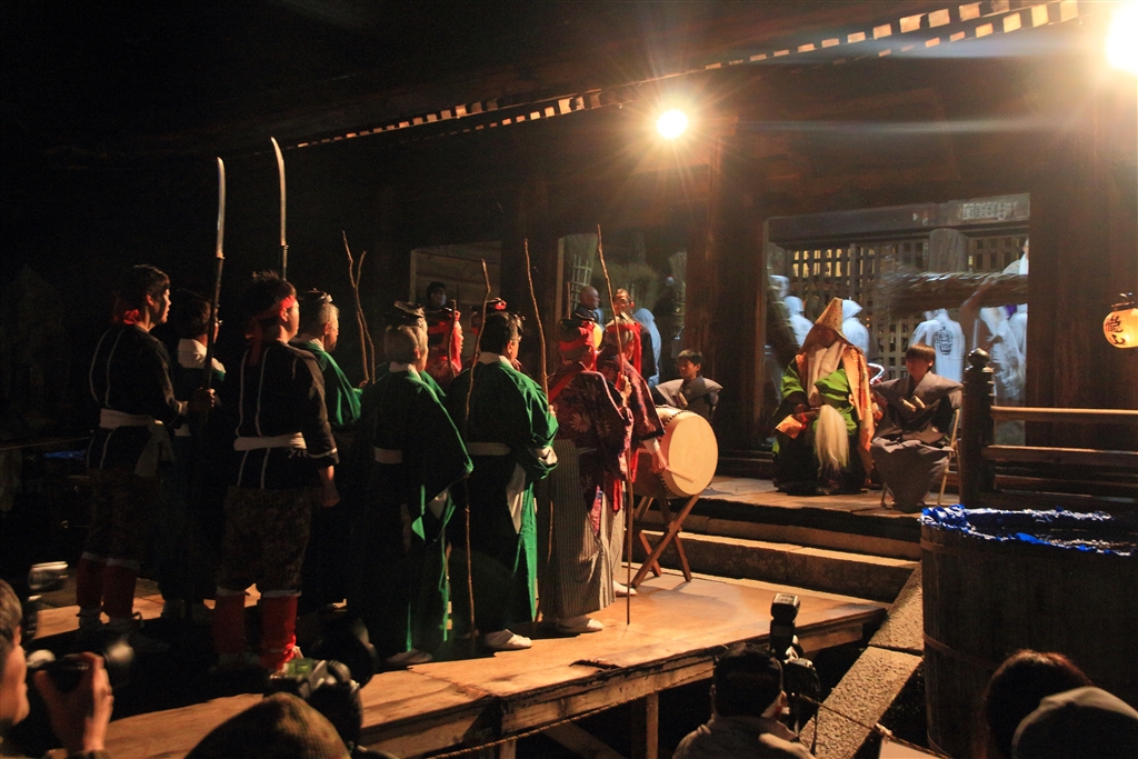 庭まつり(田遊祭り)が終わる頃には男衆が後ろで松明を用意している