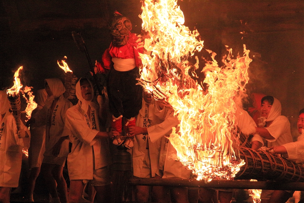 圧巻のクライマックスの火まつりでは鬼も加わる