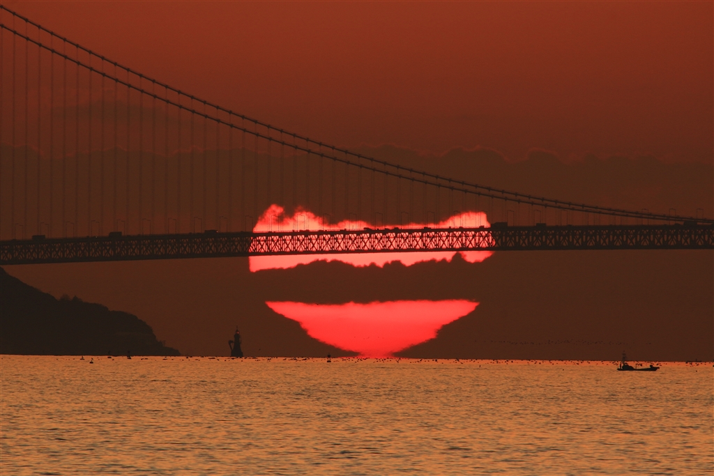 キティちゃん夕陽の右下をよく見ると無数の鳥が…