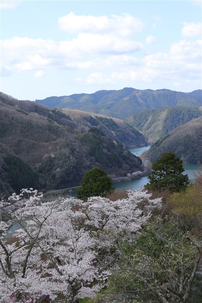 桜とダム湖、山の中腹あたり
