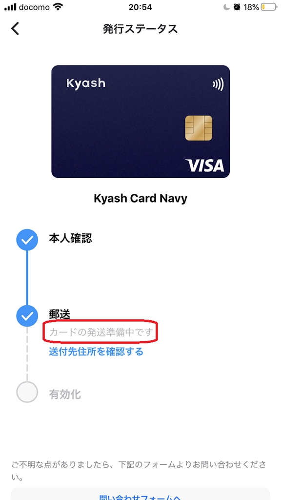 Kyashアプリの発行ステータス画面
