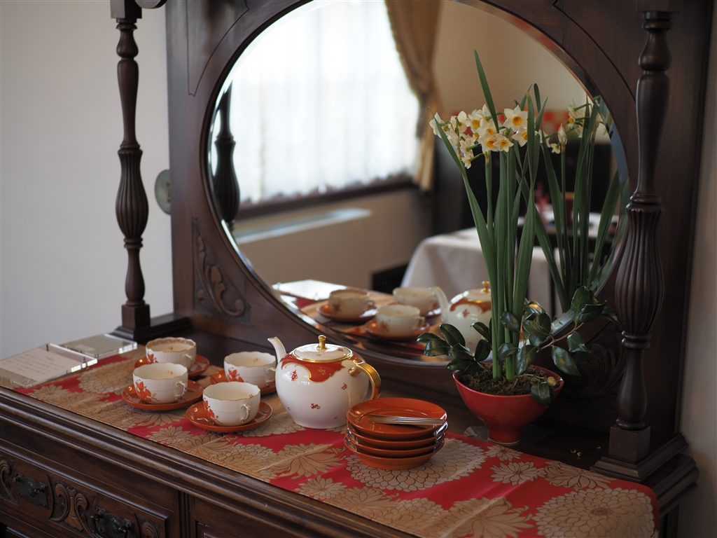 鏡の前は洋風のティーセット。でも和風の絵付です。