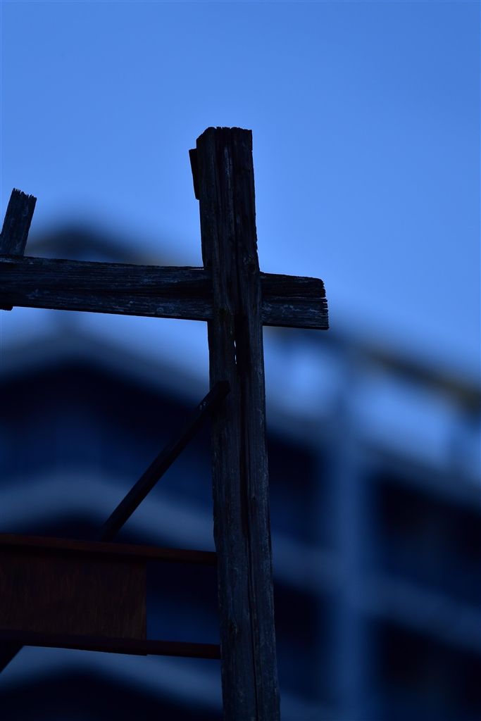 物干し場の柱と、高層マンション
