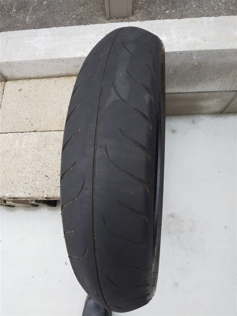標準のフロントタイヤ。左側の溝が無くなった!