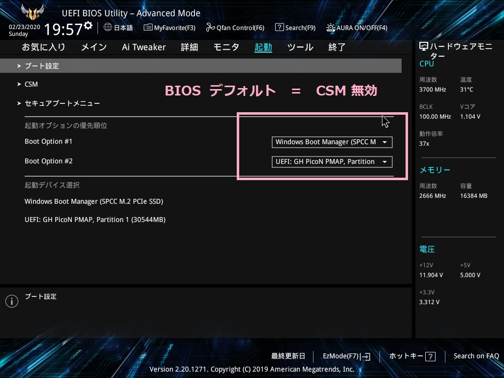 A CSMを有効にして、再びBIOSへ入ったときの設定状態