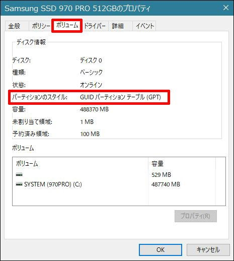 ディスク0のプロパティを開く