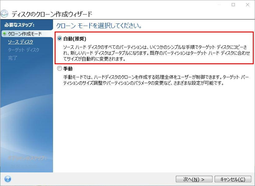 ソース(元)とターゲット(先)のディスクの管理