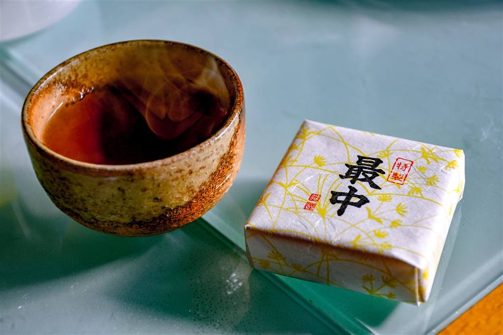 Aかぎや菓子舗で、暖かいほうじ茶と最中(もなか)を頂きました。
