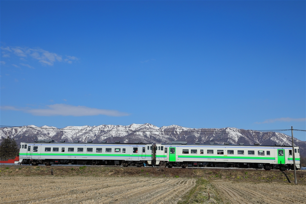 残雪の樺戸山地をバックに