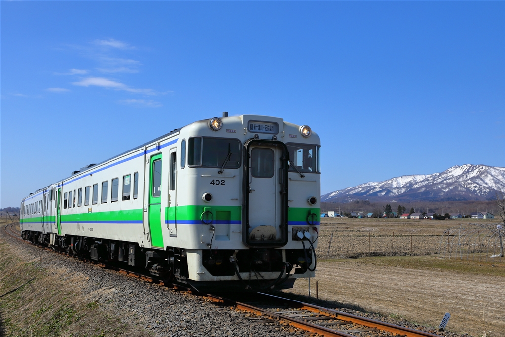 残雪の樺戸山地をバックに