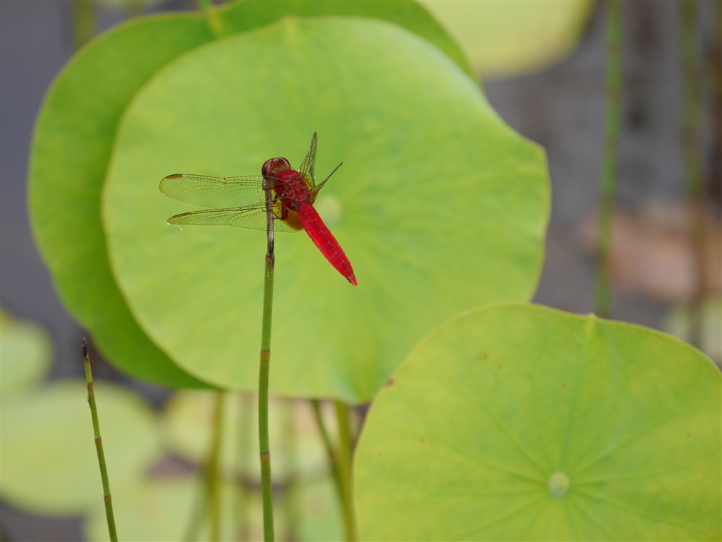 蓮池を飛び回るショウジョウトンボ。