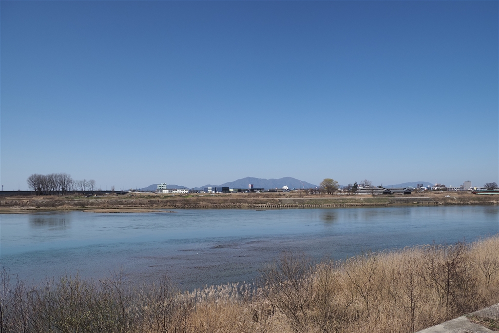35mm版24mm相当で川の土手から弥彦山。(この土手でツバメ撮ってます)