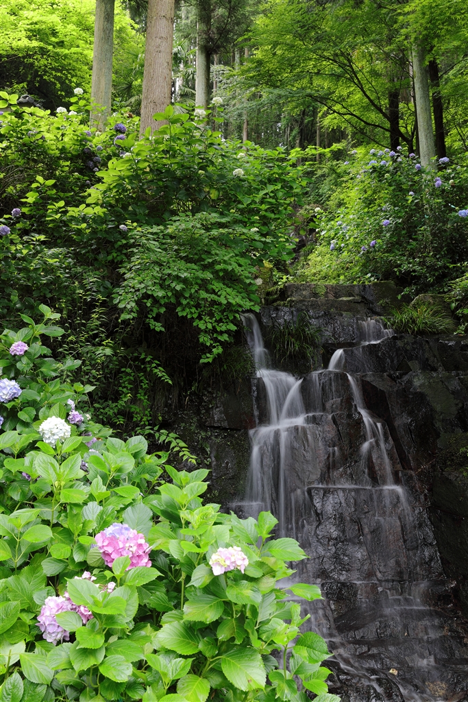 滝と紫陽花のコラボと言いたいところですが、水量も少なく今ひとつでした。
