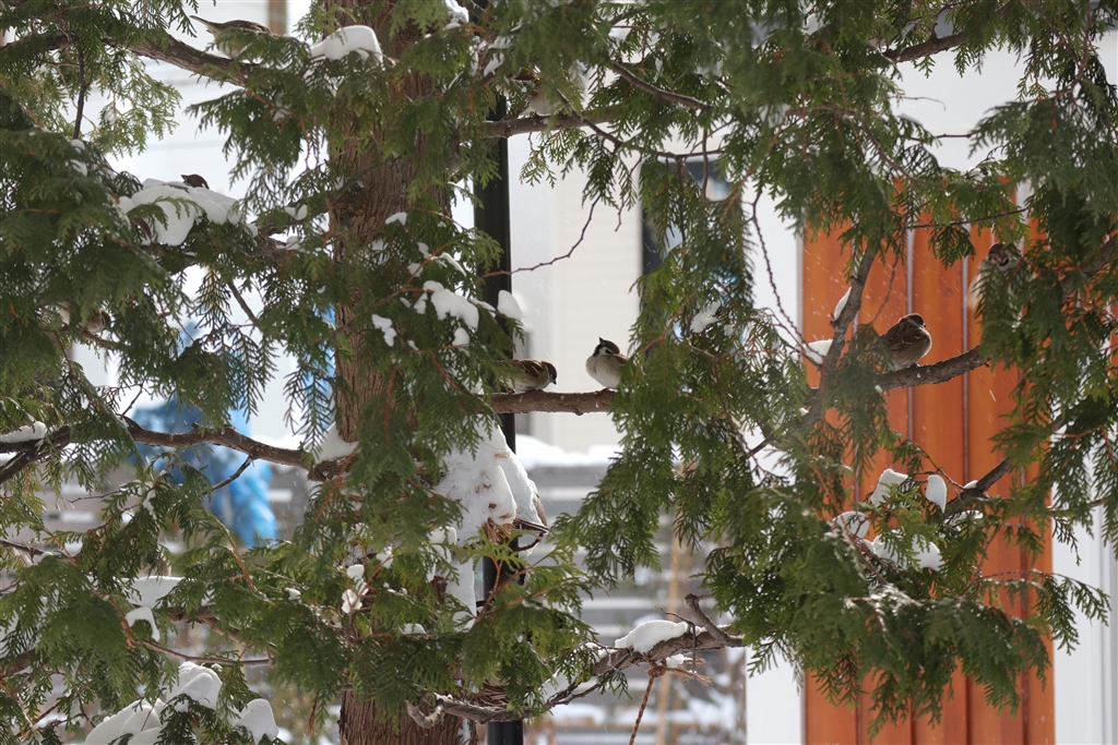 今朝は吹雪明けで、マイナス5℃、それでも元気にスズメが到来