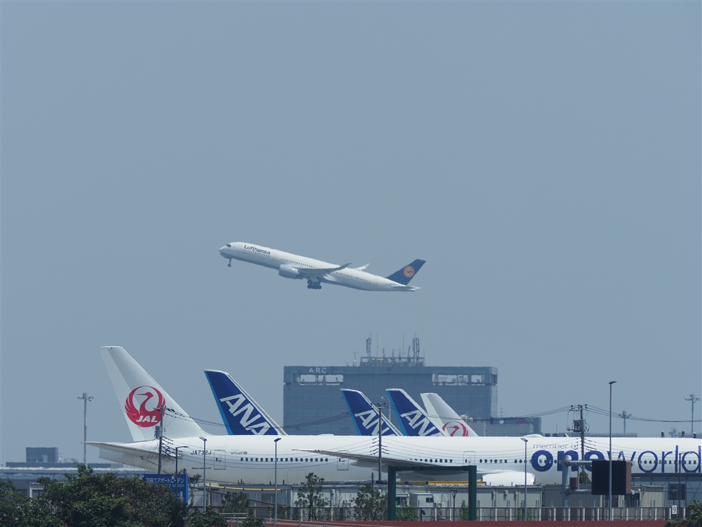 ホテル前の河原より。運良くルフトハンザのA350―900を捕捉